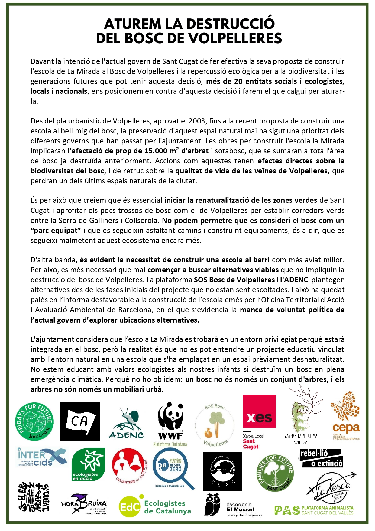 Junto a la plataforma Sos Bos Volpelleres y a otras entidades como ADENC, Ecologistes en Acció, Fridays For Future Sant Cugat, WWF o PAS Sant Cugat, desde INTERcids apoyamos el manifiesto elaborado por Assemblea Pel Clima Sant Cugat con el fin de frenar la destrucción del Bosque de Volpelleres.
